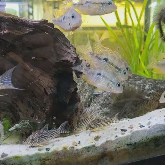 These cichlids are known for sifting through sand to hunt for food and create nesting sites, often moving sand through their gills in the process. To provide an optimal environment, it’s best to use a soft substrate such as sand that allows for easy sifting because of this be cautious with aquatics plants such as stem plants, as these cichlids may uproot them while foraging. We recommend sturdier plants, such as Anubias or java fern which can be attached to wood or rocks. These plants are ideal since they cannot be easily dislodged or uprooted.